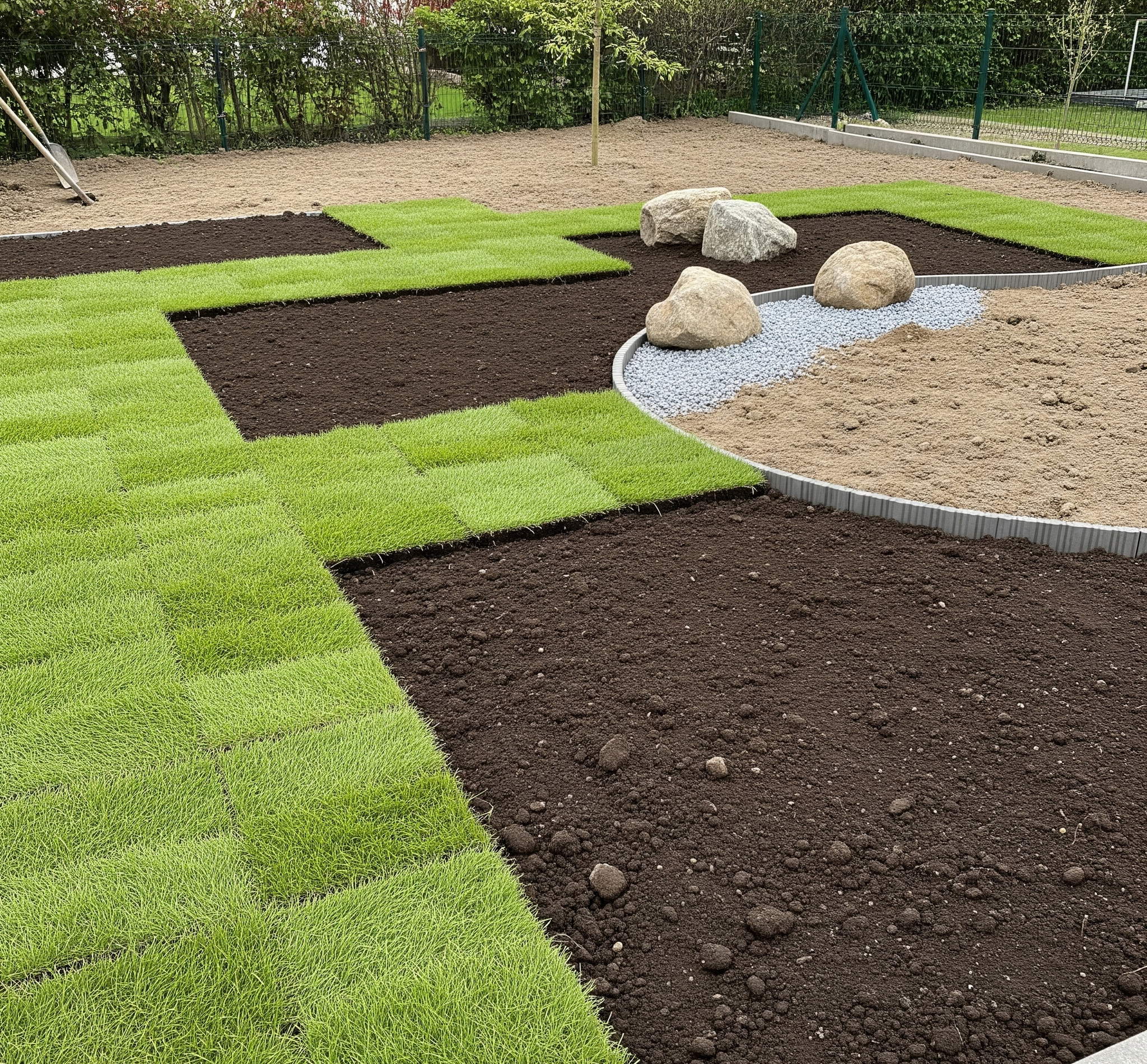- Tereprendezés és talajmunka: Szükség lehet a terep átalakítására, szintkülönbségek kialakítására vagy megszüntetésére, vízelvezetés megoldására. Friss talajréteg terítése is gyakori lépés.